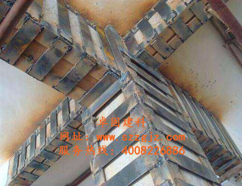 钢筋混凝土梁柱外包型钢加固称之为包钢加固,亦称粘结外包型钢加固法。当以乳胶水泥粘贴或以环氧树脂化学灌浆等方法粘贴时,称之为湿式包钢加固。该法受力可靠、施工简便、现场工作量较小,但用钢量较大,且不宜在无防护的情况下用于60℃以上高温场所,适用于使用上不允许显著增大原构件截面尺寸,但又要求大幅度提高其承载能力的混凝土结构加固。