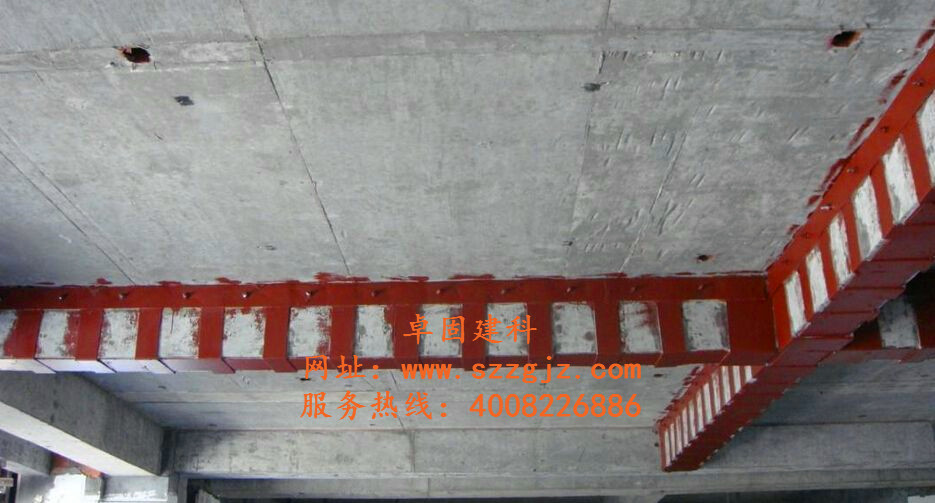 钢筋混凝土梁柱外包型钢加固称之为包钢加固,亦称粘结外包型钢加固法。当以乳胶水泥粘贴或以环氧树脂化学灌浆等方法粘贴时,称之为湿式包钢加固。该法受力可靠、施工简便、现场工作量较小,但用钢量较大,且不宜在无防护的情况下用于60℃以上高温场所,适用于使用上不允许显著增大原构件截面尺寸,但又要求大幅度提高其承载能力的混凝土结构加固。